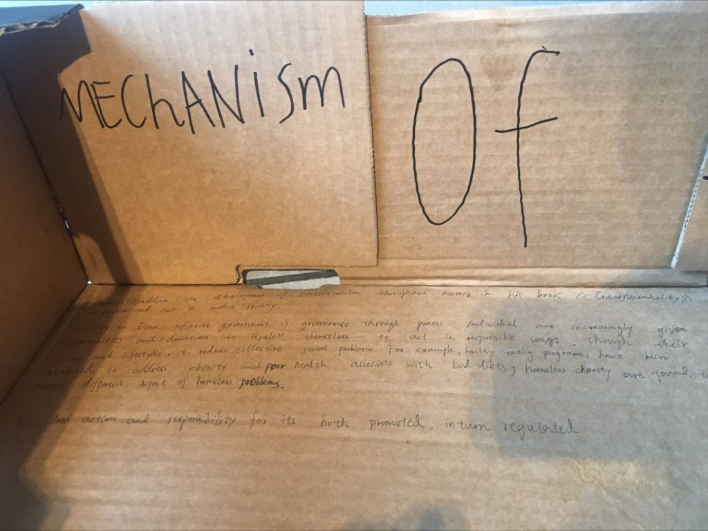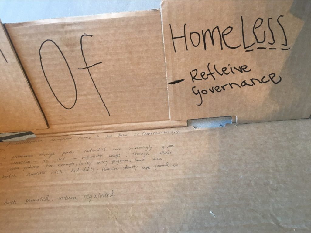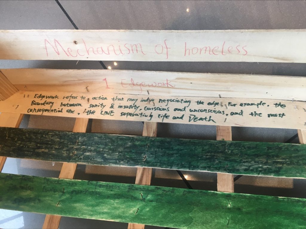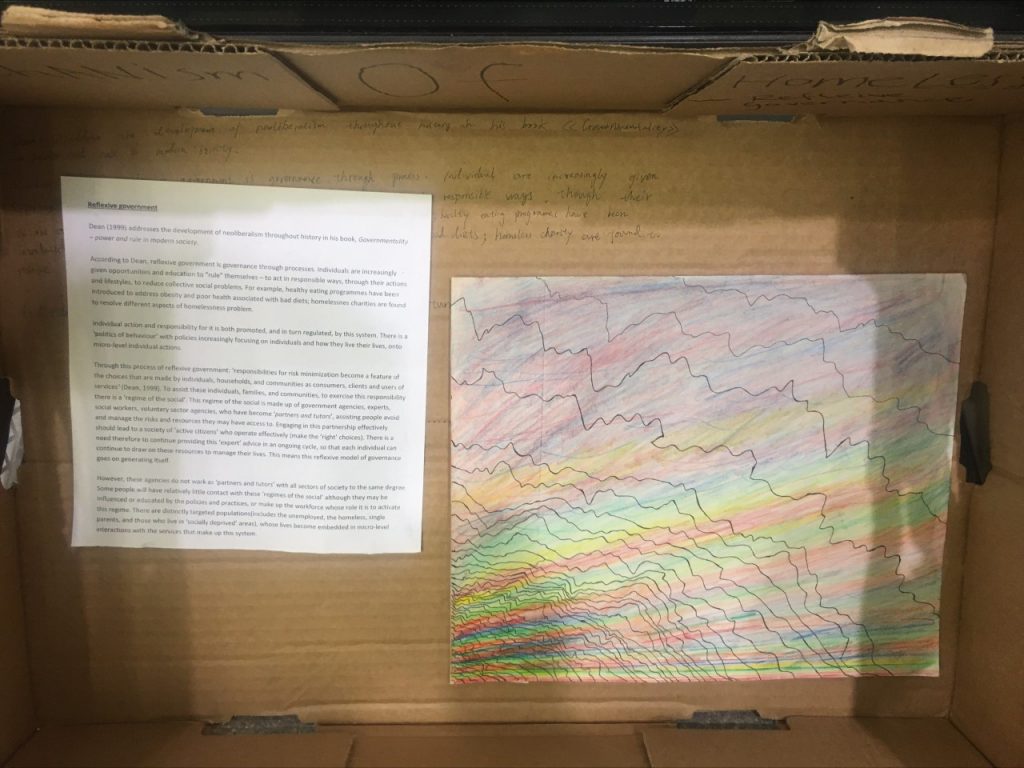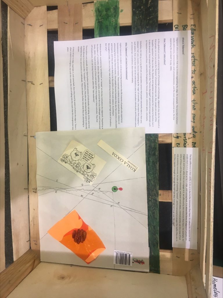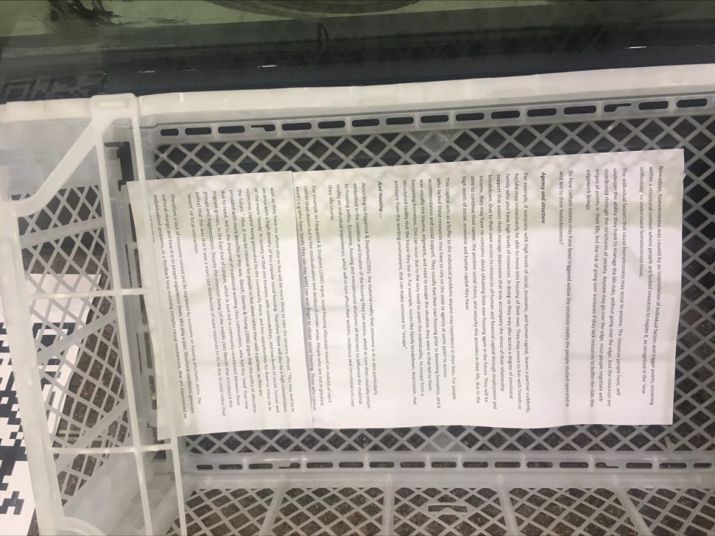 The contents are Mechanism of Homelessness in 3 different angles: Edgework, Reflexive Governance, Agency and Structure. I had sticked my literature review(which I wrote in the blog before) on each topic with a drawing by myself together in every crate. Also, I put hashtag for homeless to allow people to understand the pervalence of the issues(the #homeless has 1.8m posts in instagram).