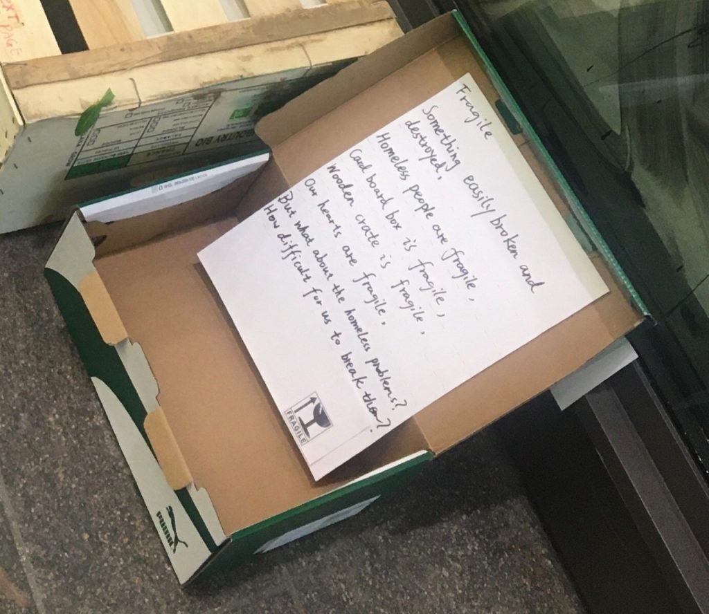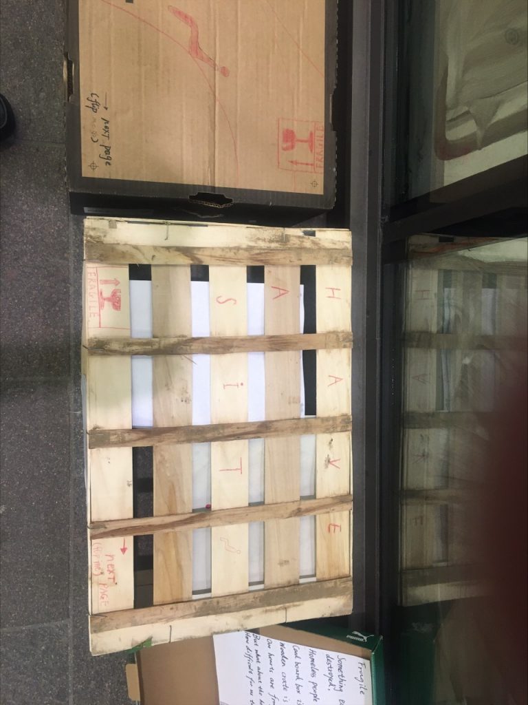 To me the word “Fragile” communicate the reality of homelessness acurately: they live with furnitures or objects like cardboradbox or wooden crates(something very temporary), and they have little resources to ensure their health and safety, they also have different level of health issues mentally or physically. But meanwhile, homeless problem seems not “fragile” at all, it has grounded in our society and become a common social phenomenon. I expect the artefect can make people to ask why and take actions, left comments through scanning the QR code.