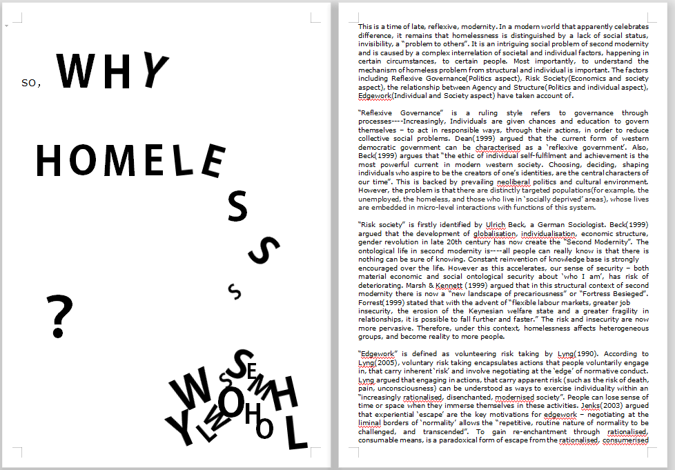 The “Education” bit means the education about homeless problem. After working in Charity for 4 months, I noticed that although many of us work so close to the homeless people, we only have a very limited angles to the problem. Many of us are not clear about why homelessness should happen? What are the mechanisms behind this problem? Currently the charity reach a dilema: we, the amateur chef team, had to spend long hours(around 9 hours) try to preparing food for homeless people every day, which is a very labourous task. Since we are not professional and not being paid, inevitaby we meet stock control problem, hyginene problem, morale problem sometime during the day which brings huge panic and frustrations. The direct impact of these issues is the decreasing volunteer attendency, since generally people do not want to work in a stressful and uncertain environment for nothing. The charity is seeking transition. Also, after reading around this topic for 2 semesters, I am confident to distill some of the key elements of this problems in to two sheets—-The mechanisms of homelessness. I try to make the artcle as succinct as possible to allow people can easily got the points. I also put reference lists at the end to help people to learn more about them.